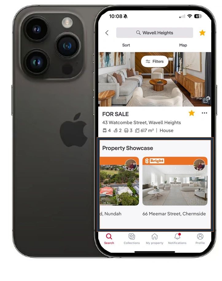 Not only do these showcases allow you to reach peripheral markets which often buyers will spill over from - or out to. We are also able to ensure our listings stay on the front page on the mobile app (pictured) these listings sit at the second "cab off the rank" permanently for the suburbs we hold showcases in, meaning you don't drop down to page 2, 3 or 4 and have to wait 15 days for a new rotation.